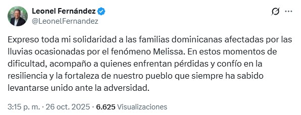 El expresidente Leonel Fernández expresó este domingo su solidaridad con las familias dominicanas afectadas por las intensas lluvias provocadas por la tormenta Melissa, la cual ha afectado a más de 700 viviendas en diferentes lugares del país.